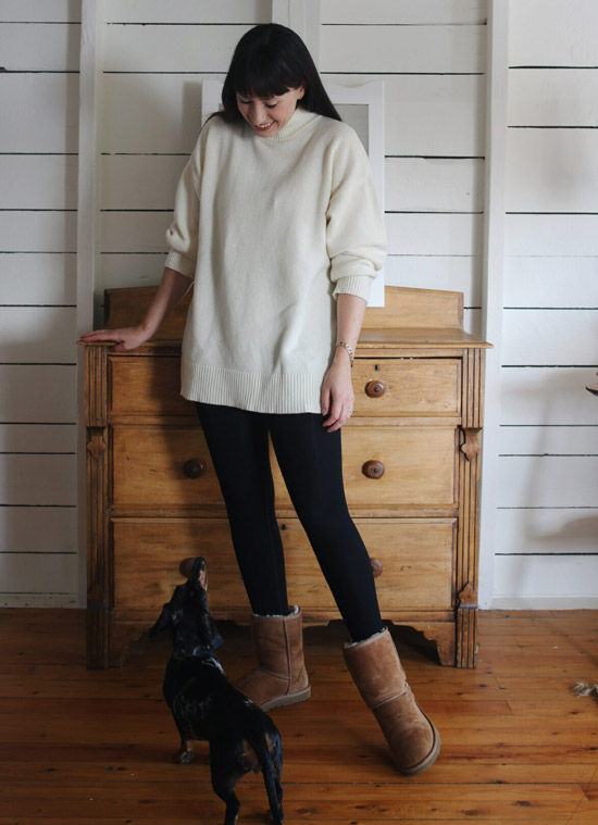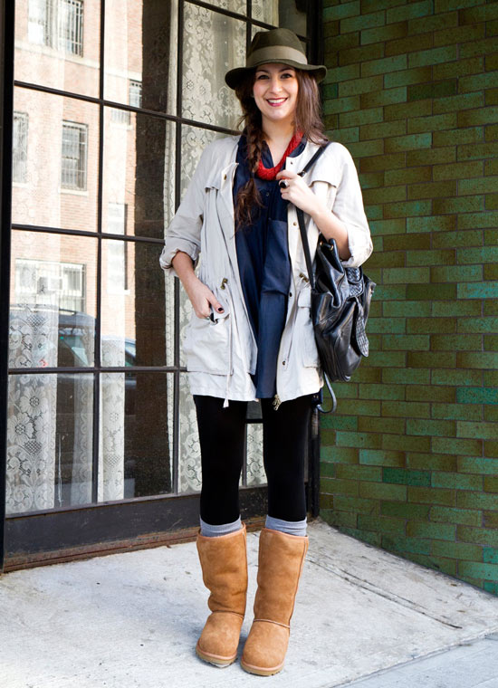 Choose a casual outfit like a trendy pullover or a graphic tee and black leggings and wear a raincoat over them. Ag boots are perfect to complete this look. These boots will make your whole style look comfortable.
