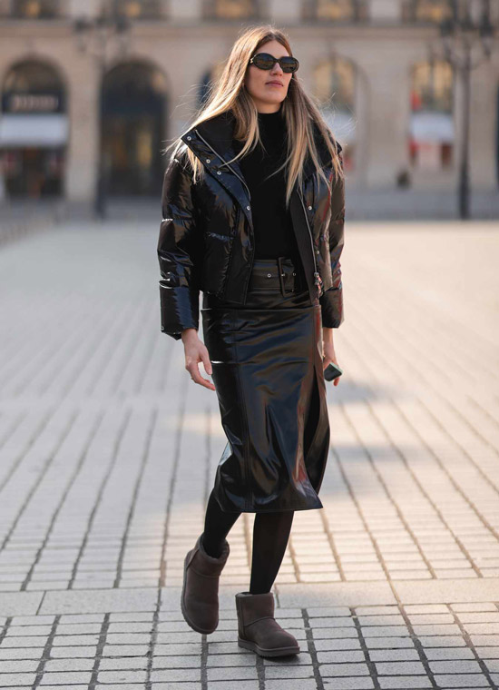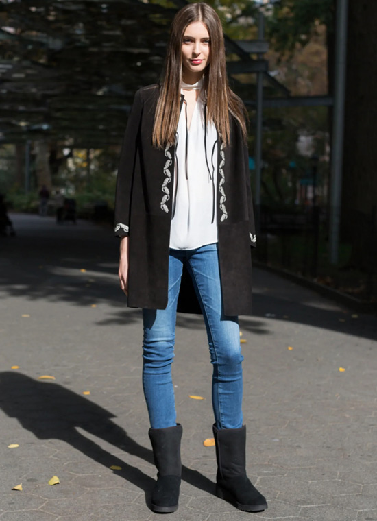 Sherpa is a type of woolen fabric, and Ag boots have a warm, soft, woolly look. That’s why together they make a great combination that makes everyone a fan of Boot Ag. So, pair your boots with a Sherpa wool coat and consider them dark and light in color to give you the most stylish look.