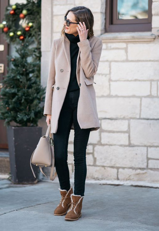 Coats not only protect you from the cold and adverse weather, but also give you a comfortable and stylish style. Complete this feeling of comfort with a boot ag. The boot style matches thick coats and is easy to pair with. So that the pants you wear do not affect the two, choose it in a darker color.