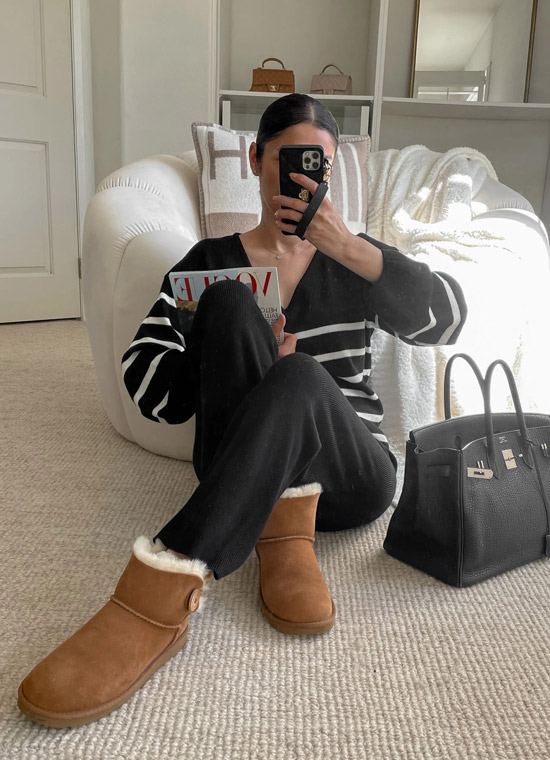 A completely casual and sporty style with which you can have a double charm. The sweatshirt and vest go well with the ag boots. If you want to complete it with a hat, a baseball cap is a good choice and has a nice casual look. If not, you haven’t lost anything without a hat.