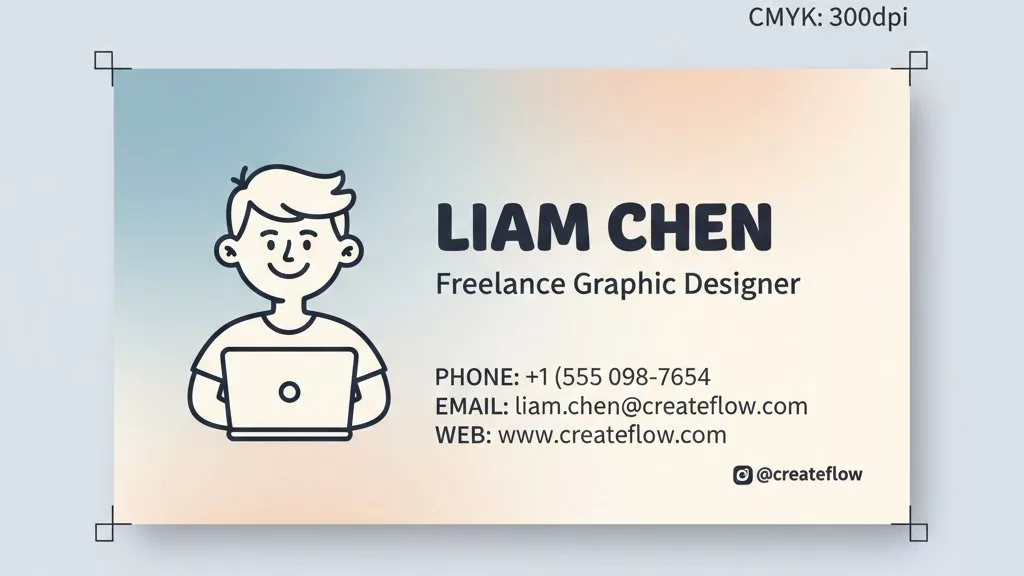 Design a personal branding business card for a freelancer.Friendly and modern style with clean typography.Focus on name, profession, and contact information.Soft and balanced color palette.Personal brand identity.CMYK, 300dpi, print-ready business card.Corporate and startup business card prompt