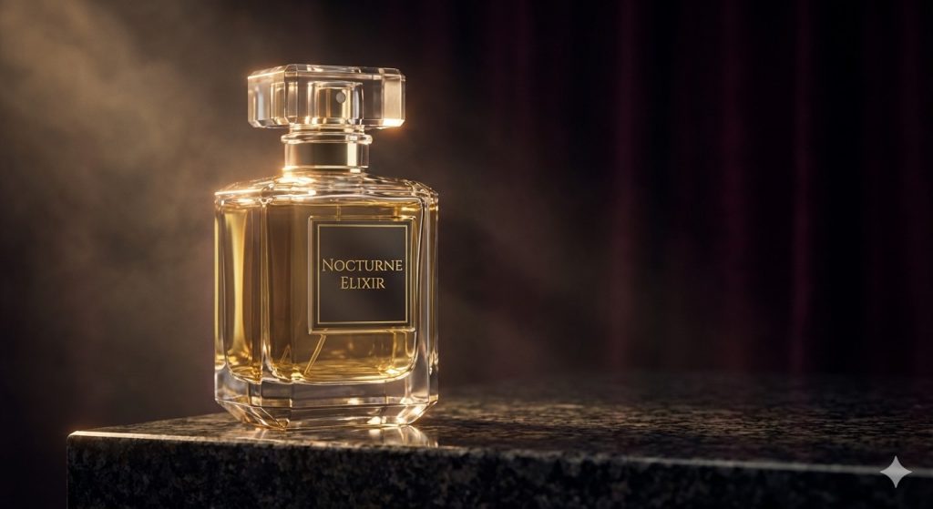 A luxury perfume bottle photography with cinematic lighting, dramatic contrast, rim light highlighting glass edges, dark moody background, reflective surface, volumetric light, shallow depth of field, 50mm lens, ultra-realistic, premium advertising style, highly detailed, 8K qualityProduct photo design prompt for shoes and sneakers
