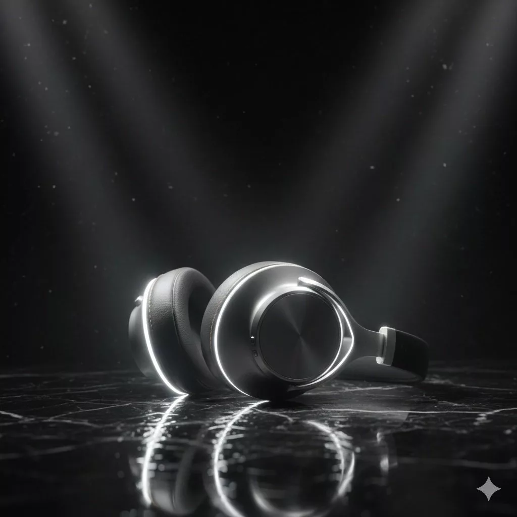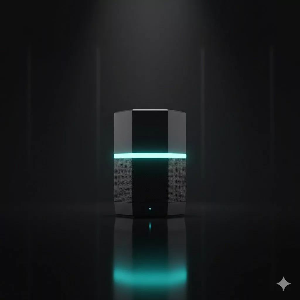 A sleek tech gadget product photography with dark background, subtle neon accent lighting, reflective surface, cinematic mood, shallow depth of field, sharp focus, 50mm lens, ultra-detailed, futuristic commercial photography style, photorealistic, 8K resolutionFood and beverage product photo prompt