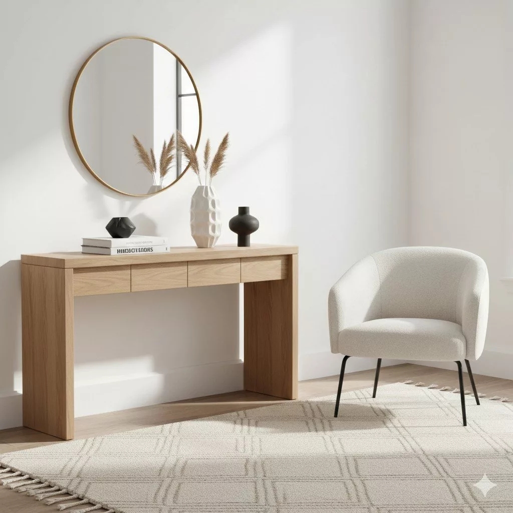 A realistic furniture and home decor product photography in a modern interior setting, soft natural light, balanced shadows, clean and elegant composition, eye-level view, realistic proportions, high texture detail, photorealistic commercial photography, 4K resolutionJewelry product photo prompt