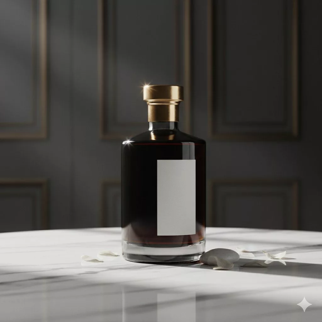 A professional cosmetic product photography of a skincare or beauty product with soft studio lighting, diffused light, clean neutral background, subtle soft shadows, glass or premium packaging texture clearly visible, studio shot, sharp focus, ISO 100, 85mm lens, ultra-detailed, photorealistic commercial photography, 4K resolutionProduct photo prompt for perfume and cologne