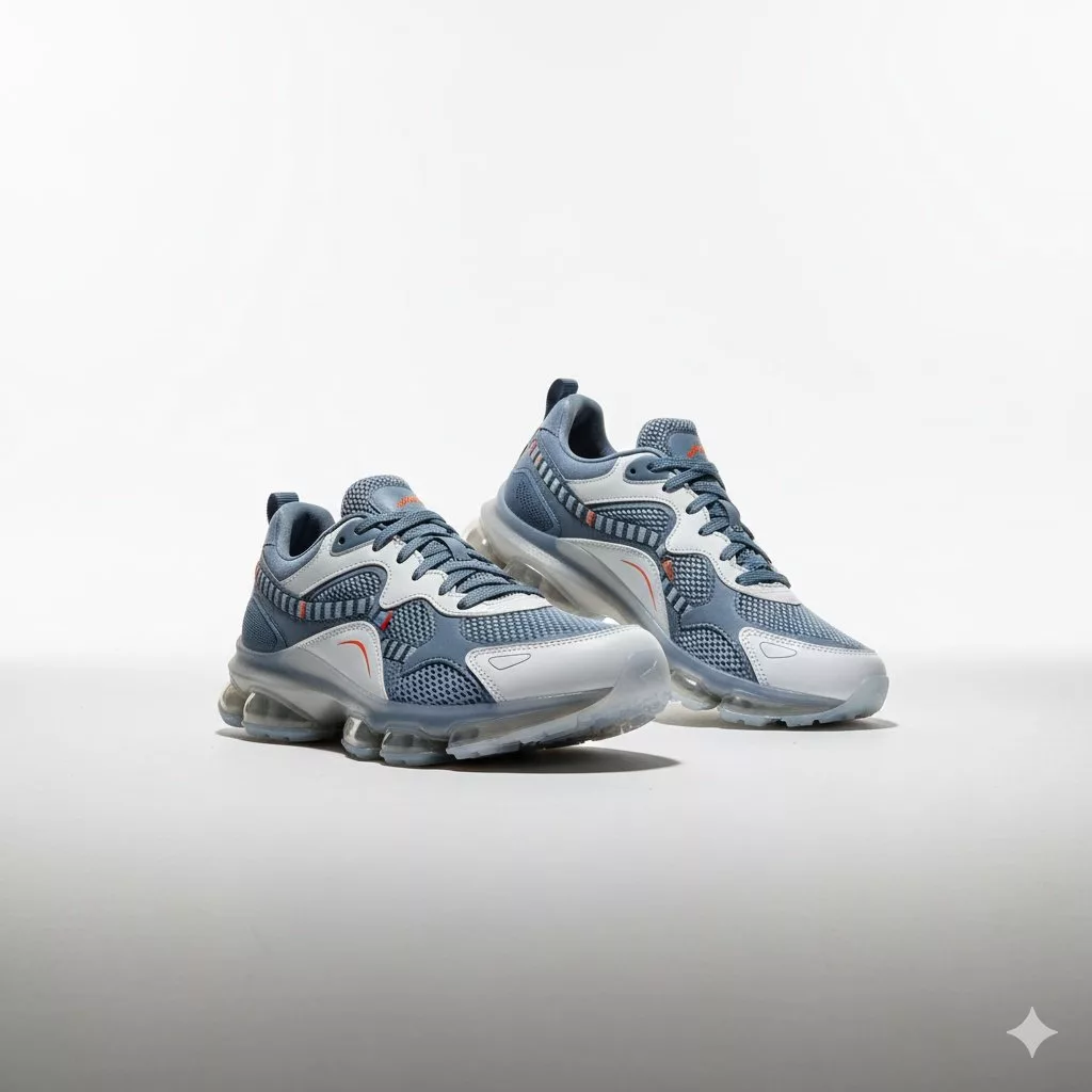 A professional footwear product photography of sneakers or shoes with clean studio background, softbox lighting, controlled soft shadows, dynamic angle, high texture detail, realistic materials, sharp focus, 35mm lens, photorealistic commercial product photography, ultra-detailed, 4K resolutionProduct photo prompt for electronic gadgets
