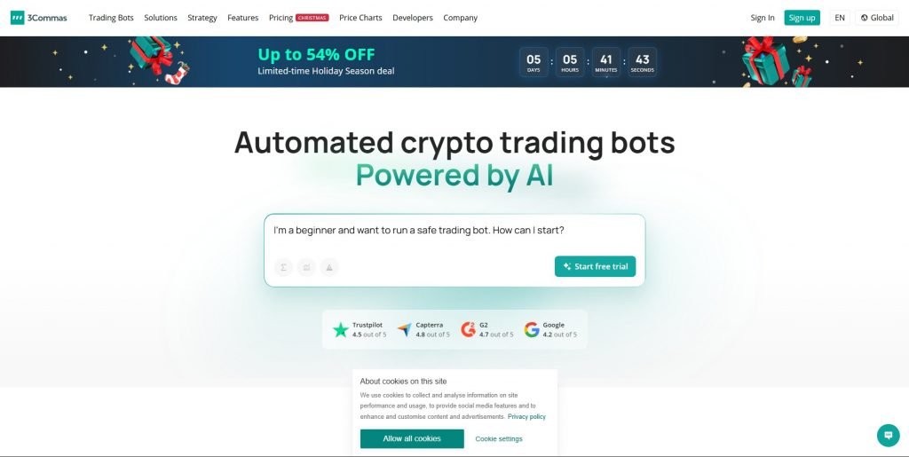 Artificial intelligence in 3Commas is more manifested in analyzing market behavior and suggesting optimal settings. This platform allows traders to both manage their manual trades more intelligently and use semi-automated robots to execute the strategy. For this reason, 3Commas is usually the choice of more experienced traders.