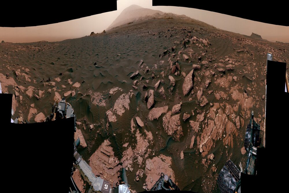 The background of the photo center is above Mount Sharp. This is the central feature of the Gale Crater in which the curiosity was explored. Parts of the dark sand were collected for analysis.