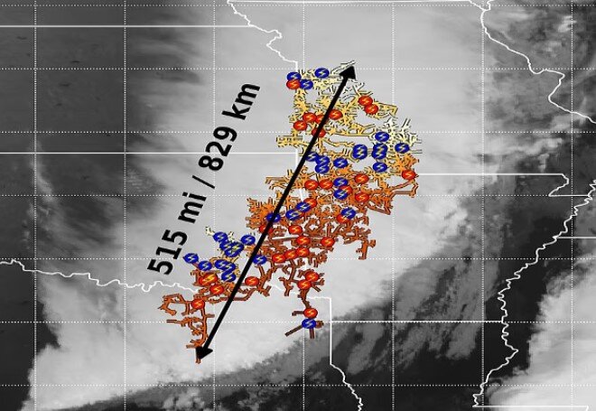 This natural event extends from East Texas to Kansas City (2 miles), which is 2 miles longer than the previous record. To show the extent of the event, it can be said that the lightning extension is twice the length of the Grand Canyon or the equivalent of the distance between Paris and Venice.