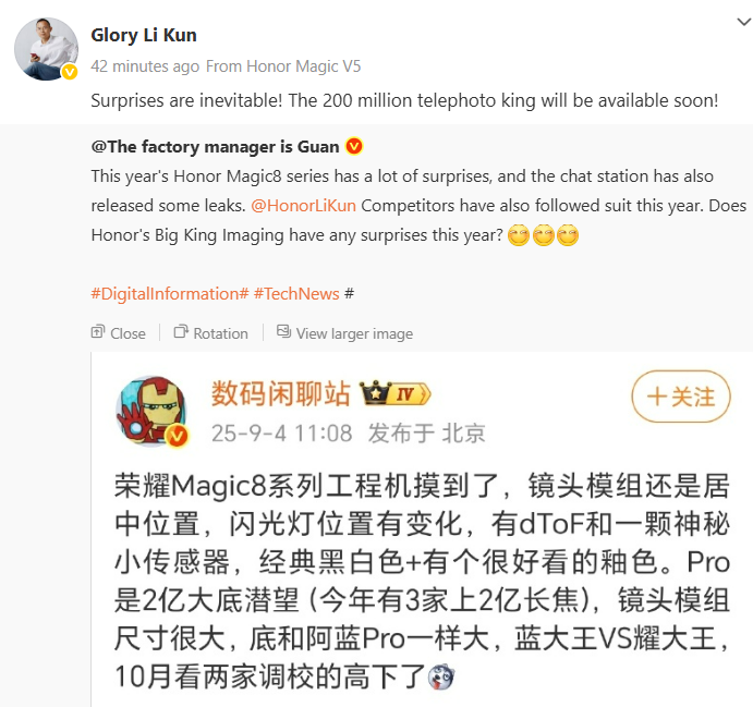 According to Lee Conon, the 5 -megapixel telephoto camera will soon be available. The post was released on the Vibo Social Network just after a reputable revelation to Digital Chat Station released new details of the Ann Magic family. The series is expected to be unveiled in the Chinese market in October.