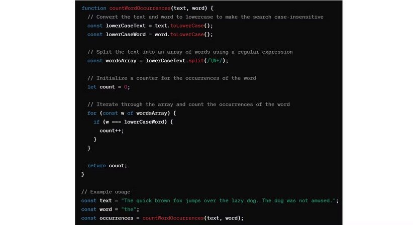 In this situation, chat bots like Gemina and ChatGPT can be useful. I asked them both to “write a JavaScript code that counts the number of times a particular word appears in a text”.