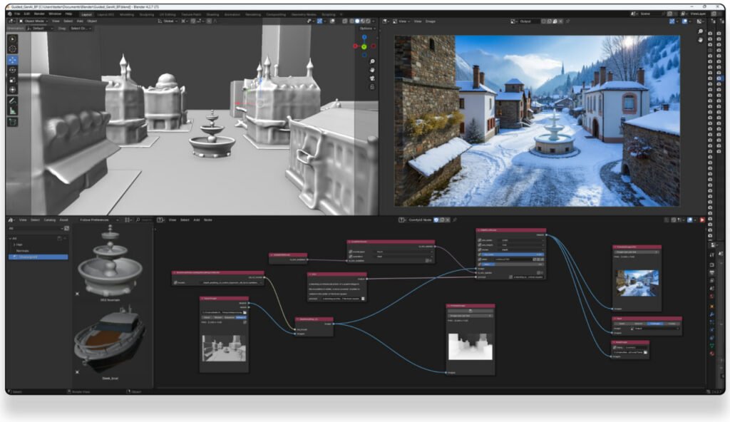 The advantage of this method than in entering the text order is more control over the details of the image. For example, if you have a specific image of the street or urban landscape (with the desired view, a certain number of trees or buildings at a specified height) you can first design it approximately in the blender and then produce high quality final image with Flux.1.