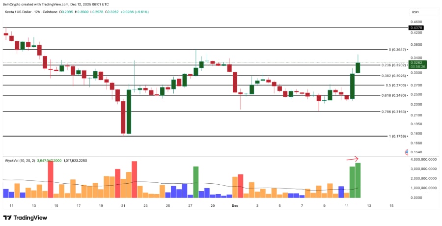 Keita has grown by about 36% yesterday. The jump comes after the launch of a new fiat bridge that makes money transfers between bank accounts and stablecoins faster. The 12-hour chart shows that KTA is testing the $0.36 level to stabilize and pave the way up to $0.43. The Wykoff index also confirms the power of buyers. On the downside, key support is at $0.27.