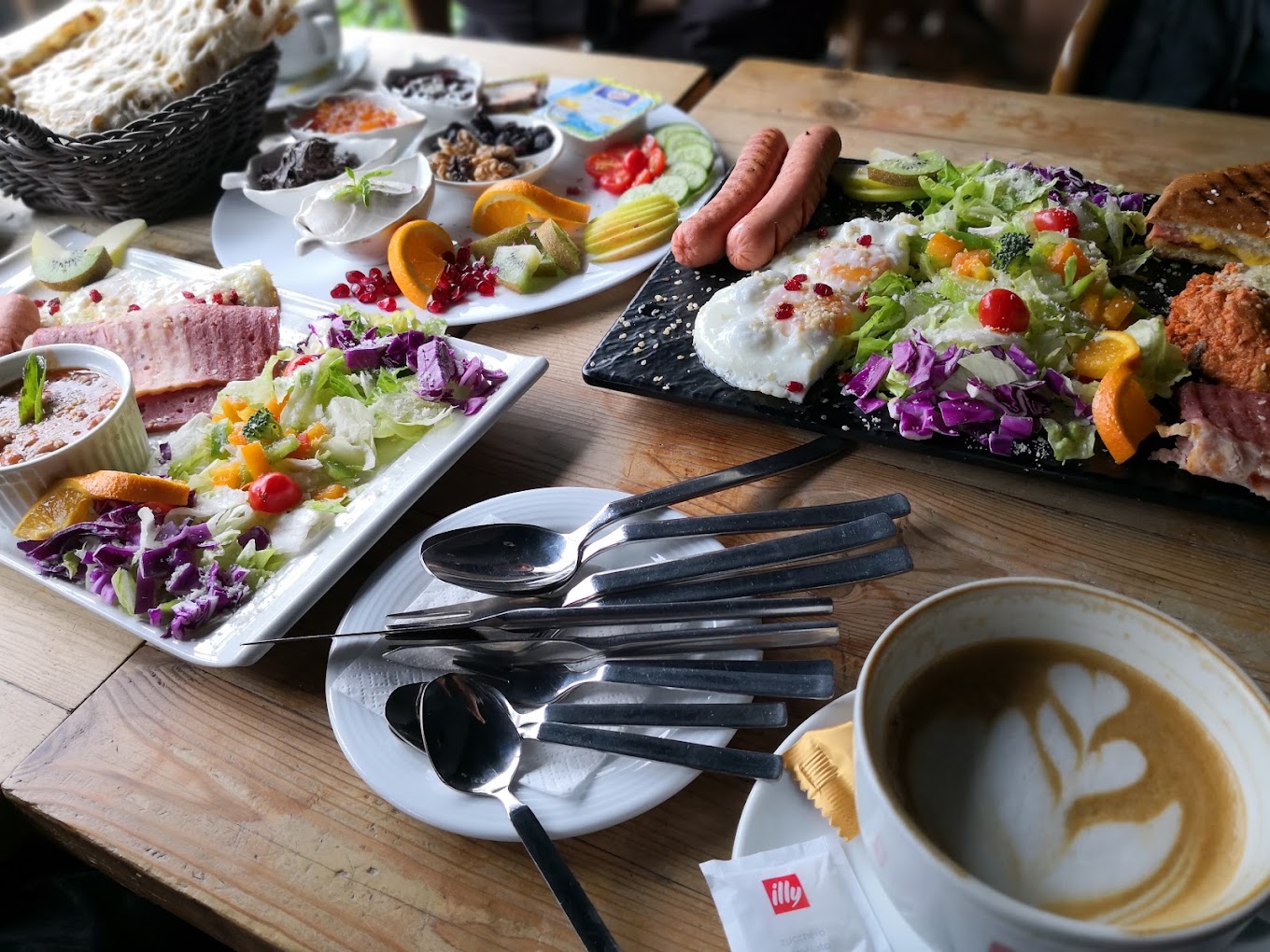 Seven Seasons tray for breakfast is one of the most popular choices, which is served for 4 to 5 people. This tray includes delicious foods such as beans, sausage, falafel, omelette, bread and cheese, jam and fresh drinks, which offers you a full serving of hearty breakfast in a pleasant environment.